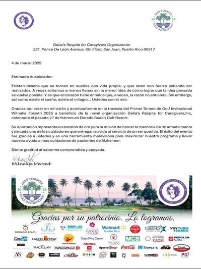 Mensaje de agradecimiento de Lady Wilnelia Forsyth-Merced a los participantes y auspiciadores del primer torneo de golf invitacional Lady Wilnelia Forsyth 2025 a beneficio de la organización "Delia's Respite for Caregivers, Inc."